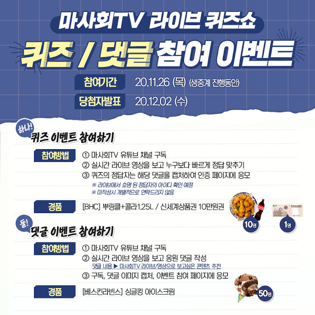 26일 라이브 퀴즈쇼가 진행되는 중에는 실시간으로 참여할 수 있는 퀴즈 참여 이벤트와 댓글 이벤트가 함께 열릴 예정이다. ‘퀴즈 참여 이벤트’는 라이브 퀴즈쇼가 유튜브에서 생중계되는 동안 퀴즈 정답을 맞추고 정답 댓글을 캡쳐한 이미지를 인증 페이지에 응모하면 참여할 수 있다. 치킨 세트와 백화점 상품권 등 풍성한 상품을 증정한다.