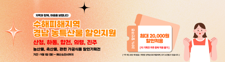 이번 특별 할인 행사는 9월 1일 시작으로 예산 소진 시까지 진행되며 경남도 공식 온라인 쇼핑몰인 e경남몰을 통해 수해피해지역 농산물, 축산물, 가공식품에 대해 20% 할인쿠폰 제공, 1인당 최대 2만 원까지(주 1회) 할인 혜택을 받을 수 있다.