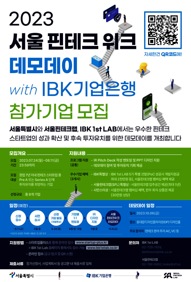 서류 심사를 통해 선발된 8개 핀테크 기업은 5주간 ‘IR 고도화 지원 프로그램‘을 거친 후 본 행사인 데모데이에 오르며, 우수 기업 3곳에게는 ▲IBK특별상:IBK기업은행의 오픈이노베이션 테스트베드 ‘IBK 1st Lab‘ 5기 특별 선발, ▲서울핀테크랩(SFL) 특별상:서울핀테크랩 입주(최대 1년), ▲시민 스타상:회식권 등 시상이 주어진다.