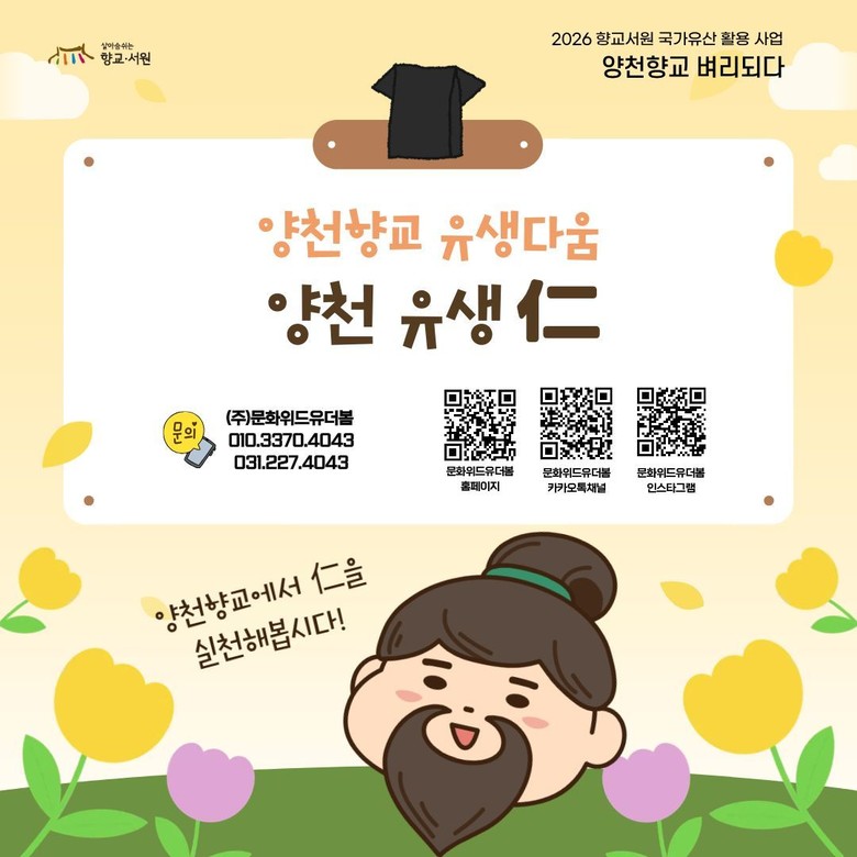 ‘양천향교 유생다움’은 인의예지(仁義禮智)를 현대적으로 재해석한 체험으로, 반려 식물 만들기 및 나눔(인), 전통악기 교육(의), 다도 예절(예), 글쓰기·전통 공예(지)로 나눠 각 덕목에 담긴 의미를 전달한다. 초등생 이상 또는 가족이 대상이며, 분야별 5회씩 운영한다.
