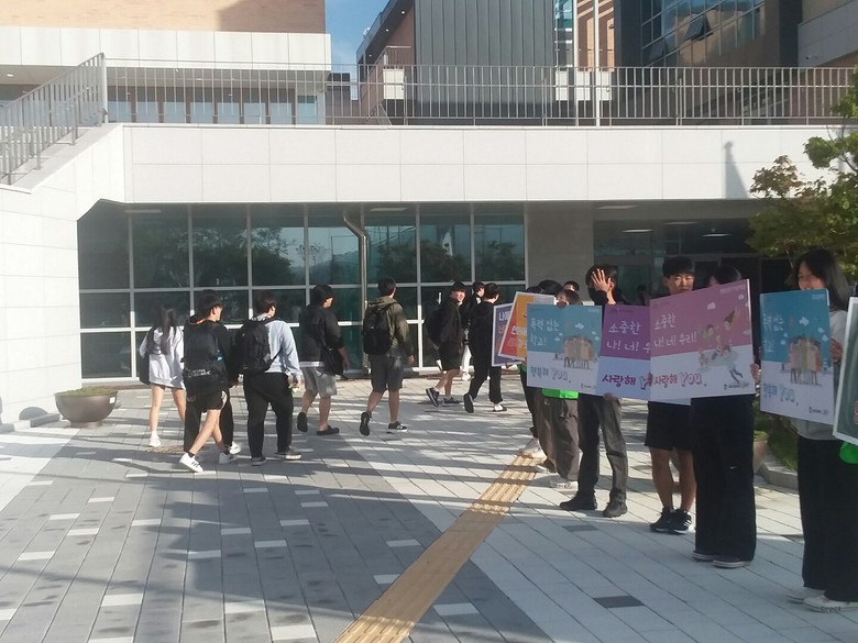 또래상담자들과 학생회 소속 학생들은 9월 22일 등교하는 모든 친구들에게 ‘당신은 선물입니다’,‘넌 할 수 있어’,‘오늘보다 밝은 내일’등의 스티커가 붙어 있는‘사랑의 간식’을 나눠주며 작은 행복을 전하는‘우정배달부’역할을 수행했다. 또한 학업중단예방, 자살예방, 학교폭력예방, 사이버폭력예방을 위한 피켓 캠페인을 통해 학교내 친구사랑, 생명사랑의 분위기가 확산될 수 있도록 메세지를 전달했다.