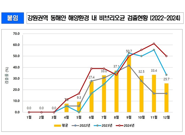 최근 3년간의 비브리오균 검출 시기는 2022년 7~9월, 2023년 8~12월, 2024년 6~12월이며, 매년 검출 기간이 점차 길어지는 경향을 보이고 있다.