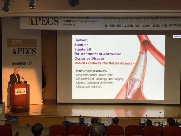 이 외에도 미국 위스콘신주 웨스트 앨리스 메모리얼 병원(West Allis Memorial Hospital) 피터 드레스처 박사(Dr. Peter Drescher, Chief of Interventional Radiology)가 참석해, 장골동맥 병변의 치료에 있어 풍선팽창형 커버드 스텐트 ‘라이프스트림(Lifestream)’이 가지는 장점에 대해 설명하고, 그 밖에도 약물코팅풍선카테터 ‘루토닉스(Lutonix)’를 활용한 동정맥루(AVF) 및 무릎아래 동맥(BTK) 협착질환 시술에 대한 강의를 진행했다.