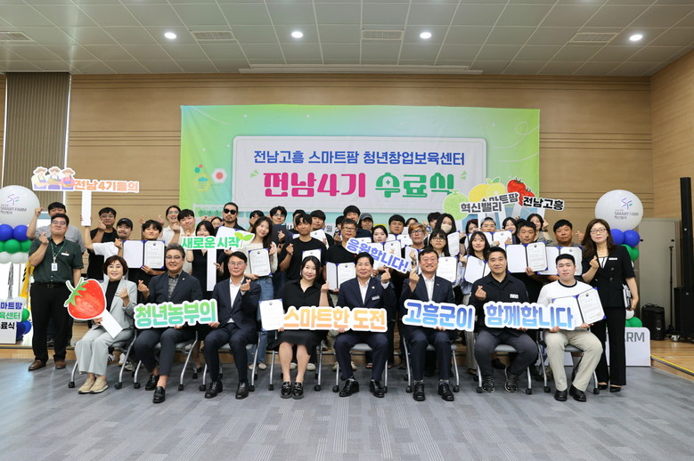 [고흥군 세계타임즈=우덕현 기자] 고흥군(군수 공영민)은 지난 23일 전남 고흥 스마트팜 청년창업 보육센터 전남 4기 교육생 47명의 수료식을 성황리에 개최했다고 밝혔다.