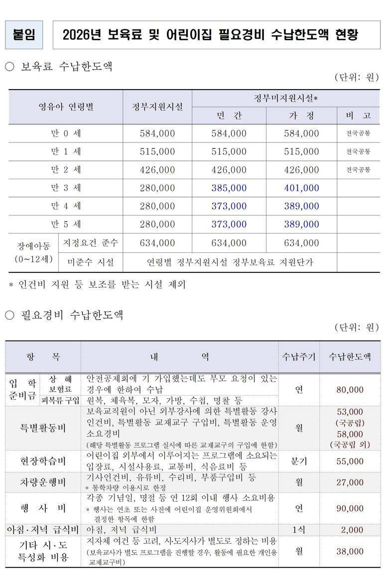 이번 결정에 따라 보육료는 지난해보다 월 8000원 오르고, 필요경비는 연 10만8000원 인상된다. 2026년도 보육료 수납한도액 및 필요경비 수납한도액은 오는 3월1일부터 시행된다.