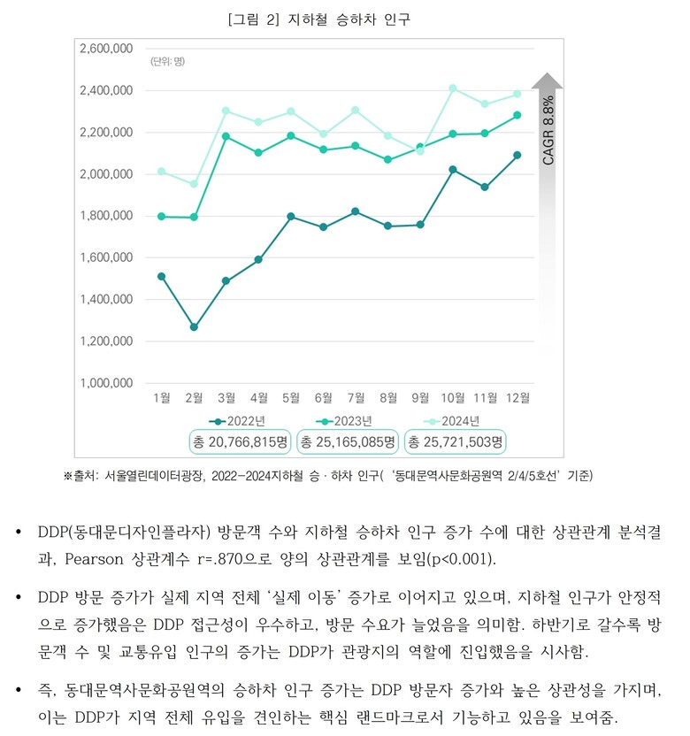 실제 유동 인구도 지속적으로 늘고 있는 추세다. ’24년 동대문역사문화공원역의 승하차 인구는 2,572만 1,503명으로 ’22년 2,076만 6,815명에서 약 23.8% 증가했다.