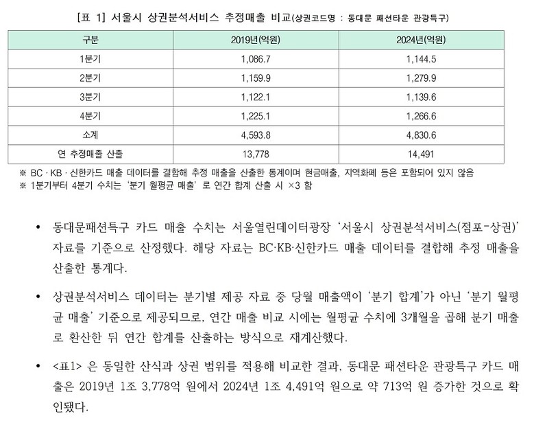 해당 자료는 BC·KB·신한카드 매출 데이터를 결합해 추정 매출을 산출한 통계이며, ‘동대문패션타운관광특구’로 분류된 상권의 연간 추정 카드 매출 합계를 기준으로 비교했다.