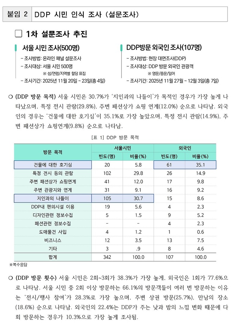 시민 대상 설문조사에서도 DDP가 단순 관람에 그치지 않고, 체류·이동·소비가 연계된 복합 방문 경험으로 작동하고 있음이 나타났다.
