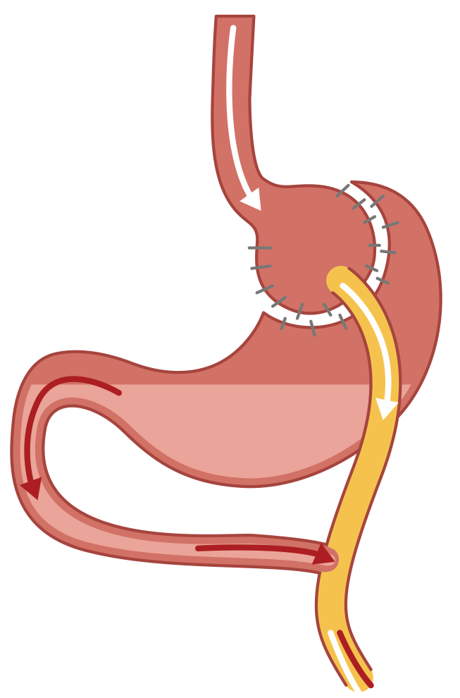 위의 상부를 15~20㏄ 용량의 작은 깔대기처럼 만들어 십이지장 아래쪽에 있는 공장에 직접 연결하는 수술이다. 나머지 잘라낸 위와 십이지장도 공장에 붙여서 두 개의 관이 공장에 연결돼 Y자형의 관이 형성된다. 위의 크기를 줄여 섭취를 제한하고, 음식물이 소화·흡수기관인 위와 소장을 거치지 않고 바로 공장으로 내려가 열량 흡수까지 줄일 수 있다. 나머지 분리된 위장에선 위액과 같은 소화효소를 공장에 흘려보내는 등 기능을 계속 한다. 장기적 체중감량과 동반질환, 특히 대사질환 개선에 탁월한 효과를 보여준다. 제2 당뇨병 등 대사 증후군의 치료에 단순한 제한적 수술보다 더욱 유용하다.