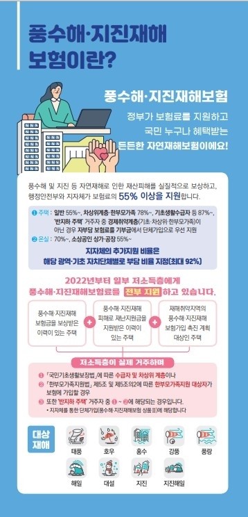 풍수해·지진재해보험은 2008년부터 시행한 국가정책 보험이다. 태풍, 홍수, 호우, 강풍, 풍랑, 해일, 대설, 지진, 8개 재해를 보장한다. 주택·온실 소유자와 세입자, 상가나 공장을 소유한 소상공인이라면 누구나 가입할 수 있다.