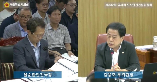 | ▲ 지난 9월 3일 열린 제332회 임시회 도시안전건설위원회 물순환안전국 및 서울물재생시설공단 업무보고에서 김용호 시의원이 청계천 20주년 기념행사 관련 준비를 철저히 해달라고 주문하고 있다. |