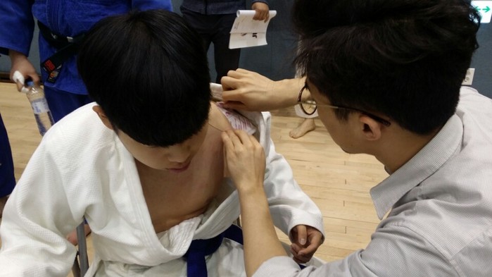 | ▲분당자생한방병원 의료진이 유도 대회에 참가한 선수를 치료하고 있다. |