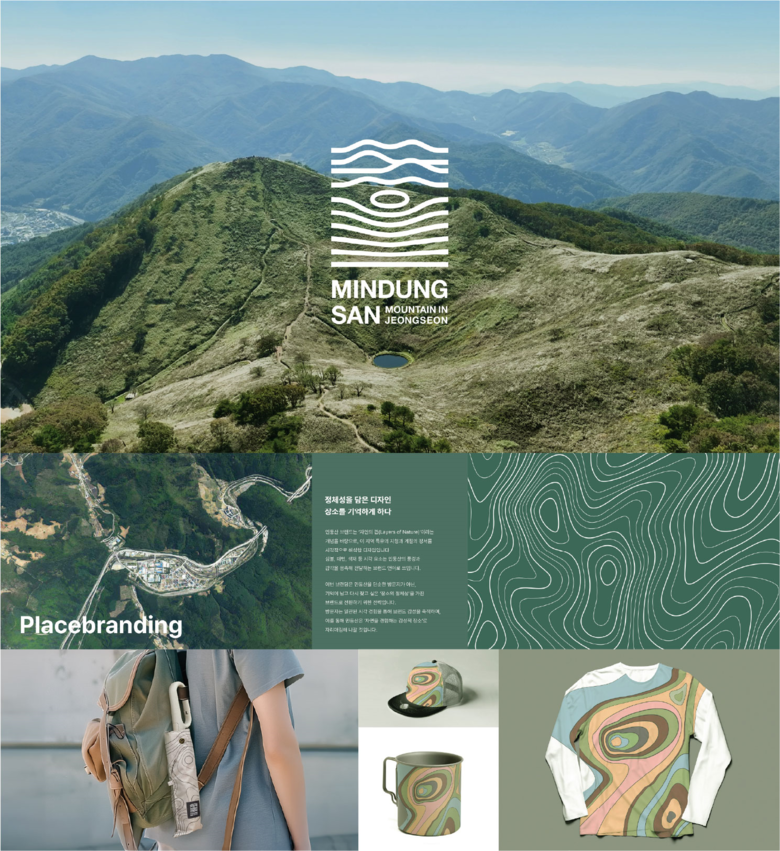 민둥산 브랜드는 산, 물, 바람, 구름, 풍경의 겹 -‘자연의 겹(Layers of Nature)’을 주제로 한 장소 브랜드로 정선 민둥산 풍경을 곡선 ‘능선의 리듬, 억새의 생동감, 돌리네의 깊이, 하늘의 여백’이 서정적으로 중첩되는 ‘감성의 레이어’로 표현한 것이 특징이다.