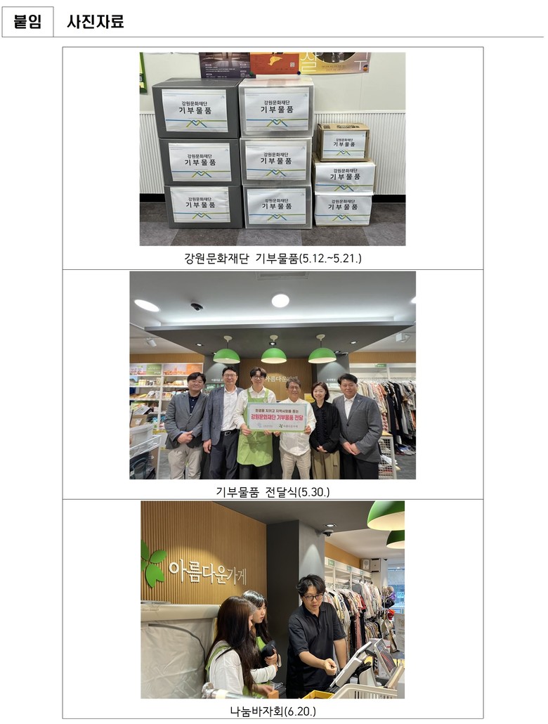 올해 처음 추진된 나눔바자회는 아름다운가게 춘천석사점에서 문화재단의 기부 물품에 대한 판매 행사로, 지역사회와 함께 나눔의 가치를 공유하고자 마련되었다. 해당 판매를 통해 발생한 수익금은 전액 지역 내 취약계층 지원에 사용될 예정이다.