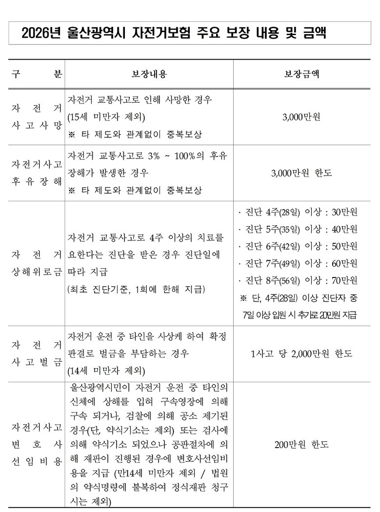 [울산 세계타임즈=이호근 기자] 울산시는 울산시민이면 누구나 자전거 사고 시 보험 혜택을 받는 ‘2026년 자전거 보험가입 지원사업’을 추진한다고 밝혔다.