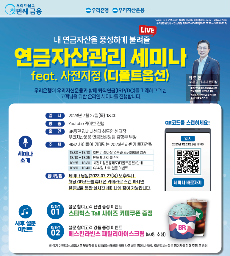 참여를 희망하는 고객은 세미나 시간에 맞춰 QR코드를 통해 유튜브에 입장해 참여할 수 있다. Q&A 코너를 통해 생방송에서 실시간으로 퇴직연금 자산에 관련된 다양한 궁금증을 해결하고 설문 참여로 소정의 경품도 받을 수 있는 이벤트도 마련했다.