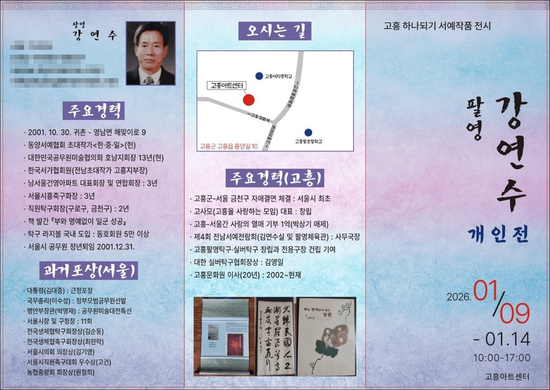 이번 전시는 고흥군 영남면에 거주하는 팔영 강연수 작가의 개인전으로, 총 40여 점의 서예 작품이 전시된다. 강 작가는 평소 고흥의 새로운 변화와 개혁, 군민 화합을 기원하는 글귀를 군 대표 누리집에 게시해 왔으며, 이 가운데 70점 중 22점을 선정해 서예 작품으로 제작했다.