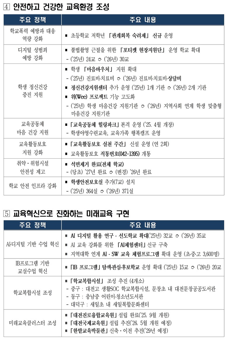 「바른성장지원사업」과 「학생 마음바우처」운영으로 학생의 신체·정서의 균형 있는 성장을 지원하고, 교육공동체 힐링파크 개장과 대전특수교육수련체험관 개관, 에듀힐링센터·위(Wee)센터 확장 이전 등 교육가족을 위한 심리·정서 지원 여건을 개선하였다. 또한, 늘봄지원실장 배치와 초등 2학년까지 맞춤형프로그램 확대로 초등방과후·돌봄의 책임성을 높이고, 무상급식비와 교육급여 교육활동비 단가를 인상하여 모든 학생이 건강하고 즐겁게 성장할 수 있도록 지원을 강화하였다.