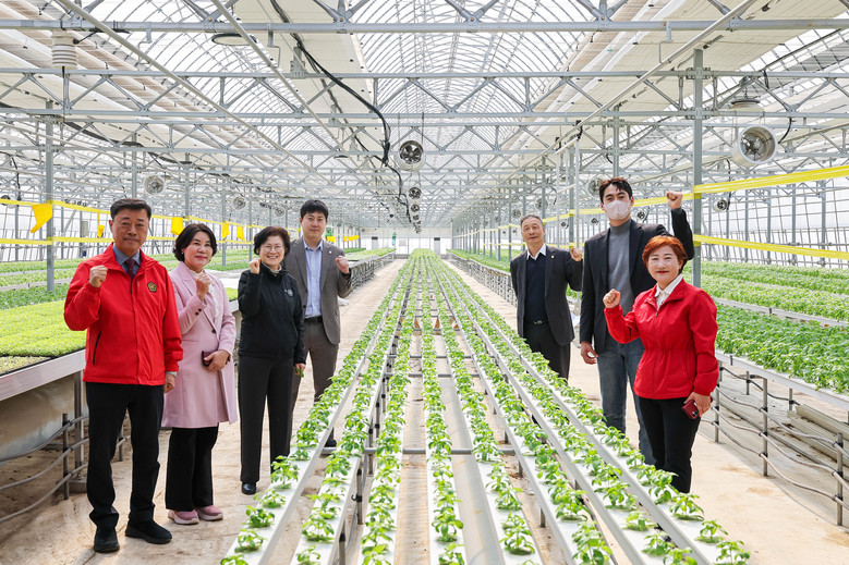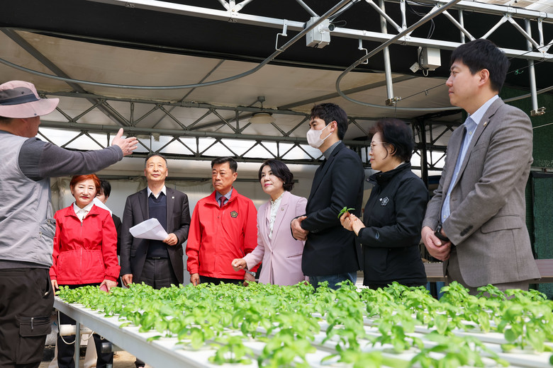 이날 현장에서 시설을 둘러본 위원들은 지중열 냉온풍 시스템과 고설양액재배 시설, CCTV 및 원격 환경제어 시스템 등 첨단 설비들을 확인했으며, 특히 유럽종 채소와 설향 딸기 등 신소득 작물의 생육 상태를 꼼꼼히 살폈다.