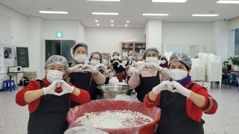 지난 19일 신천지 도마지파 시온기독교선교센터 116기 수료생과 성도들이 새알심을 만들고 있다.