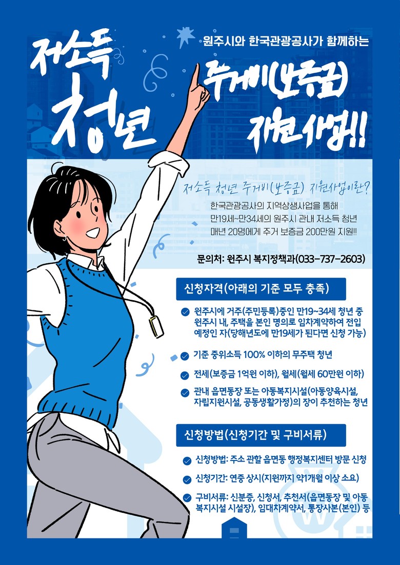 지원 대상은 원주시에 거주하고 있는 중위소득 100% 이하의 무주택 청년가구(만 19∼34세) 중 읍면동장 및 아동복지시설의 장이 추천한 자이며, 보증금 1억 원 이하, 월세 60만 원 이하의 주택을 본인 명의로 임차 계약하고 있어야 한다.