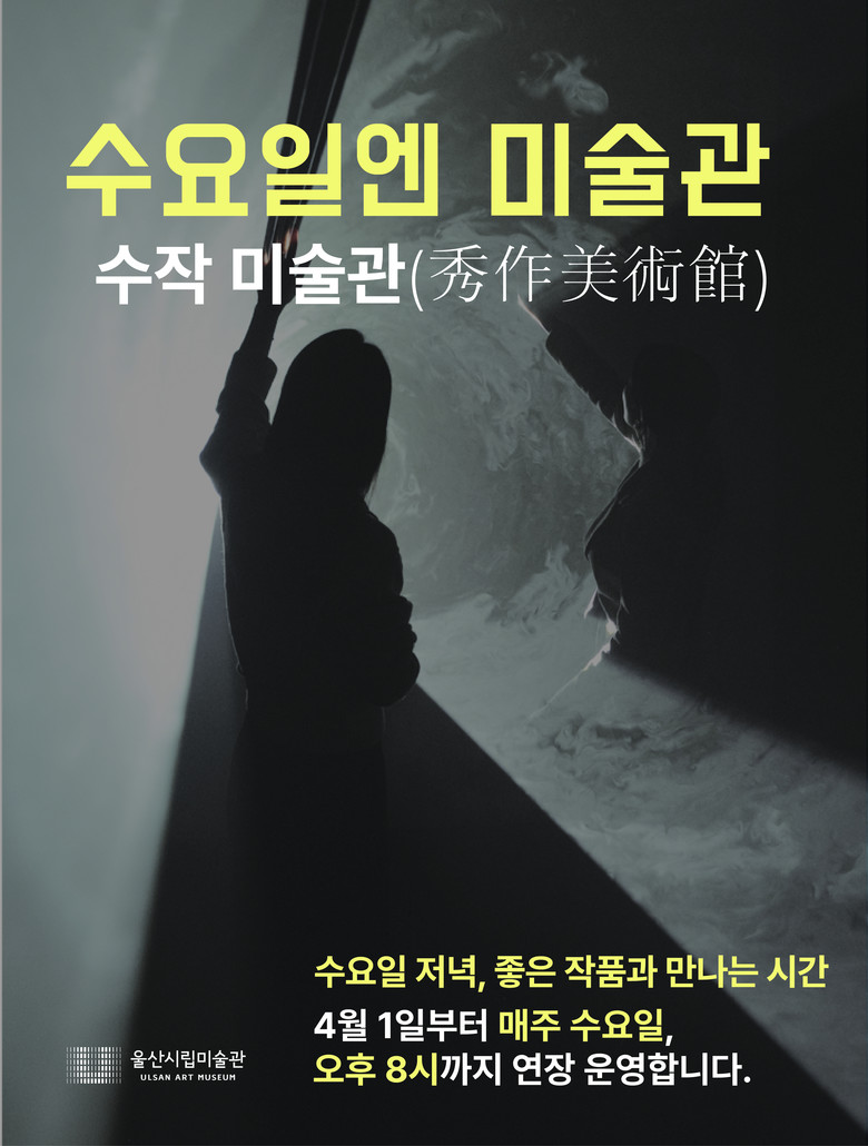 울산시립미술관은 시민들의 문화 향유 기회를 넓히기 위해 오는 4월부터 매주 수요일 운영 시간을 연장하는 ‘수작미술관(秀作美術館)’을 운영한다고 밝혔다.