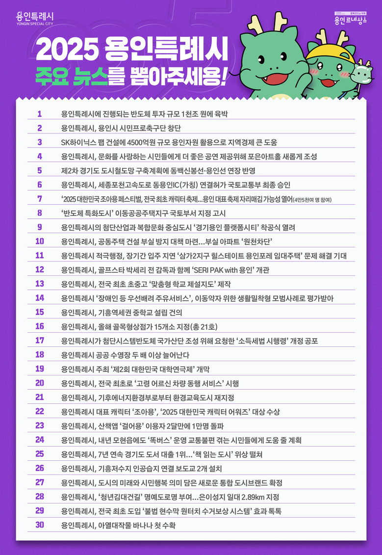 시 관계자는 “2025년은 용인특례시가 문화·스포츠·도시개발 등 다양한 분야에서 한 단계 이상 성장한 한 해였다”며 “한 해를 마무리하며 모두가 용인의 성장 여정을 함께 되짚어보고, 더 나은 미래를 향한 한 걸음을 함께 내딛는 이번 주요 뉴스 투표에 적극적인 참여를 부탁드린다”고 말했다.