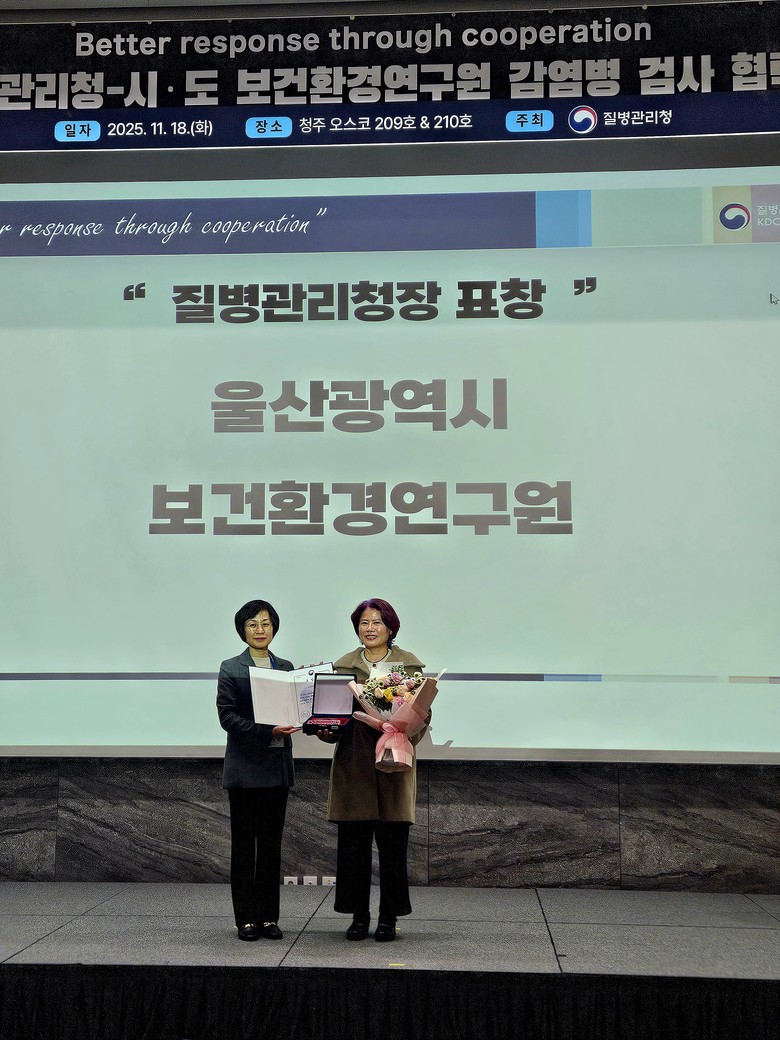 [울산 세계타임즈=이호근 기자] 울산보건환경연구원은 지난 18일 개최된 ‘2025년 질병관리청-시·도보건환경연구원 감염병 검사 협력 심포지엄’에서 ‘감염병 검사 우수기관’으로 선정돼 질병관리청장 표창을 수상했다고 밝혔다.
