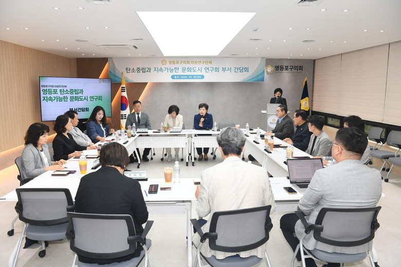 [영등포구 세계타임즈=이장성 기자] 영등포구의회 의원연구단체 ‘탄소 중립과 지속 가능한 문화도시 연구회’(대표 이순우 의원)는 15일 영등포구의회 다목적회의실에서 관련 부서와 간담회를 열고 탄소중립과 문화도시 조성을 위한 실천 방안을 논의했다.