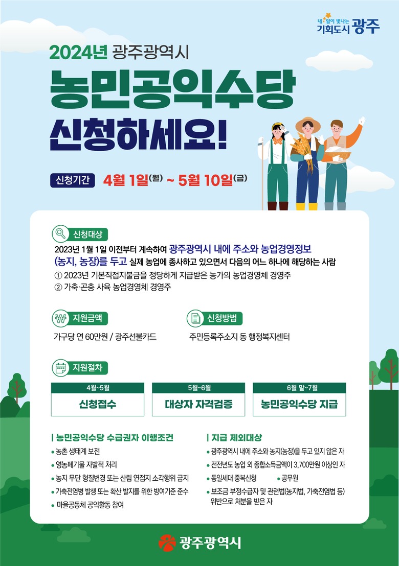 대상은 2023년 1월 1일 이전부터 계속해 광주광역시에 주소와 농업경영정보(농지, 농장)을 두고 실제 농업에 종사하고 있으면서 전년도 기본형직불금을 지급받은 농업경영체 경영주 또는 가축·곤충 사육 농업경영체 경영주다. 다만 농업경영체 공동경영주, 부부 또는 동일 세대이면서 경영체를 분리해 여러 건으로 등록한 경우 한 사람만 신청할 수 있다.