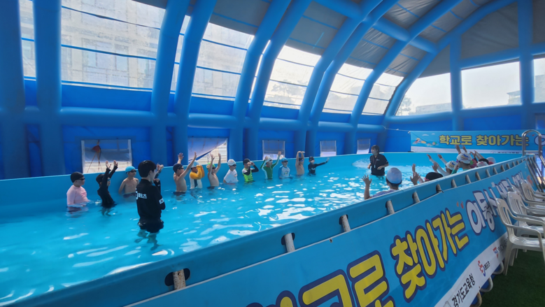 [시흥시 세계타임즈=송민수 기자] 2024.8.20.(화) 은빛초등학교(교장 송상훈)는 안전하고 집중력 있는 교육으로 생존수영 교육의 효율성을 극대화하고자 “학교로 찾아가는 이동식 생존수영교실”운영을 시작했다.