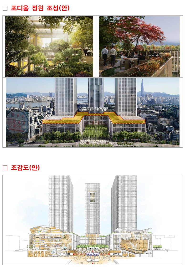GBC 중앙에는 영동대로와 지상광장을 연결하는 14,000㎡의 대규모 ‘도심숲’도 들어선다. 민간개발 복합단지 내 녹지공간 중 국내 최대 규모로 서울광장(13,207㎡)보다 크다. 영동대로 상부 지상광장(13,780㎡)과 합하면 강남 도심권에 서울광장 2배 규모의 시민 녹지공간이 확보되는 셈이다.