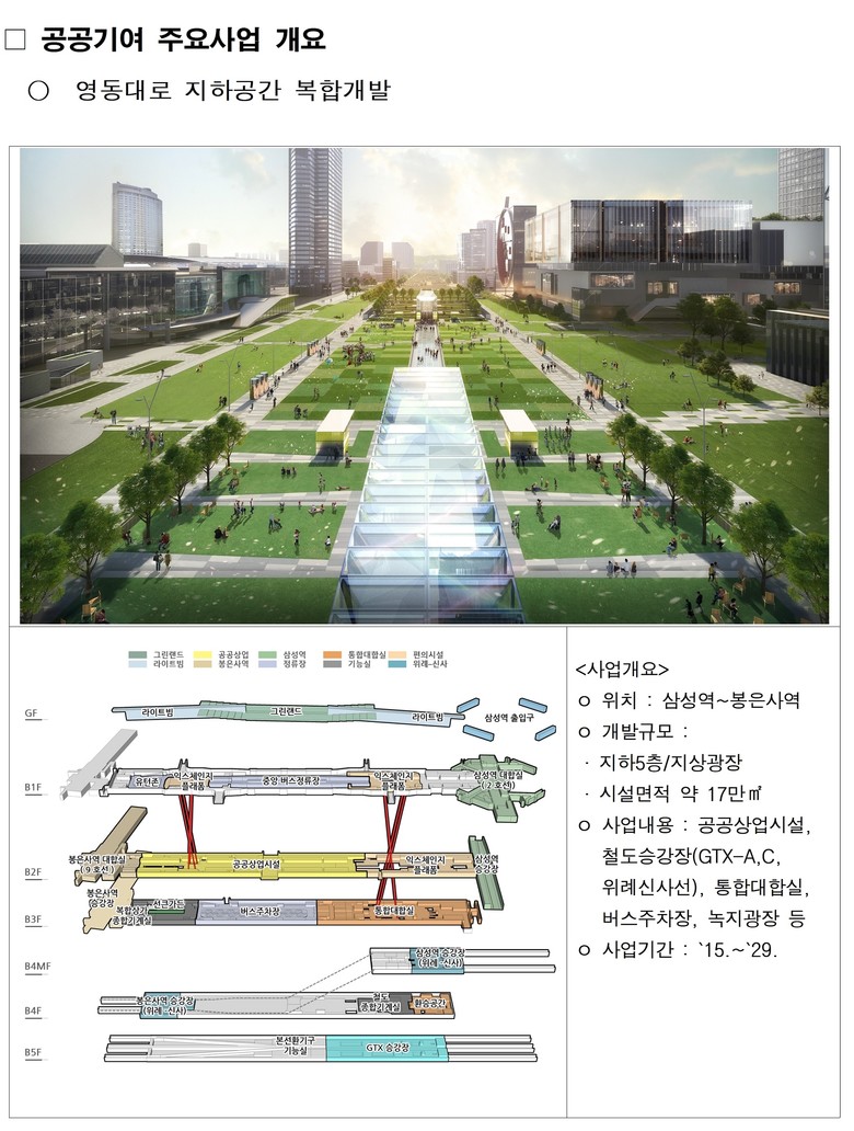 영동대로 지하 복합환승센터는 5개 철도 노선(GTX-A, C, 도시철도 2호선‧9호선 및 위례신사선)이 만나는 대중교통의 혁신적인 허브 역할을 할 것이며, 지상부 도로가 녹지광장으로 변화하면 코엑스~영동대로~GBC~탄천~잠실 스포츠.MICE~한강까지 이어지는 중심보행축을 통해 지역 일대가 보행중심공간으로 변모될 예정이다.