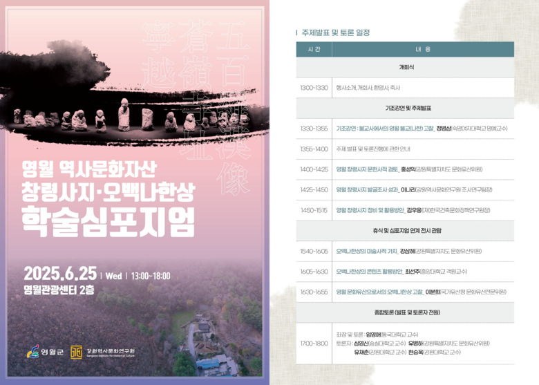 1부 발표는 홍성익 위원(강원특별자치도 문화유산위원)의 「영월 오백나한상 출토지의 사명寺名에 대한 문헌사적 검토」, 이나리 팀장(강원역사문화연구원)의 「창령사지 발굴조사와 성과」, 김우웅 원장(한국건축문화정책연구원)의 「영월 창령사지 정비 및 활용방안」 순으로 진행된다.