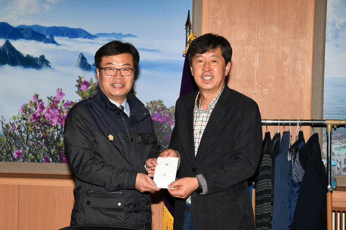 [양구군=세계타임즈 김민석 기자] 이상건 양구군의회의장이 12일 산불피해를 입은 강원도 속초시의회를 방문해 최종현 속초시의장에게 성금 및 생필품을 전달했다.