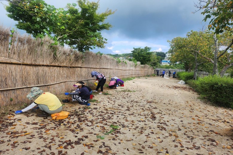 | ▲ 25년도 하반기 지역공동체 일자리 사업 참여자들이 순천만습지 탐방로에서 잡초제거 활동을 하고 있다 |