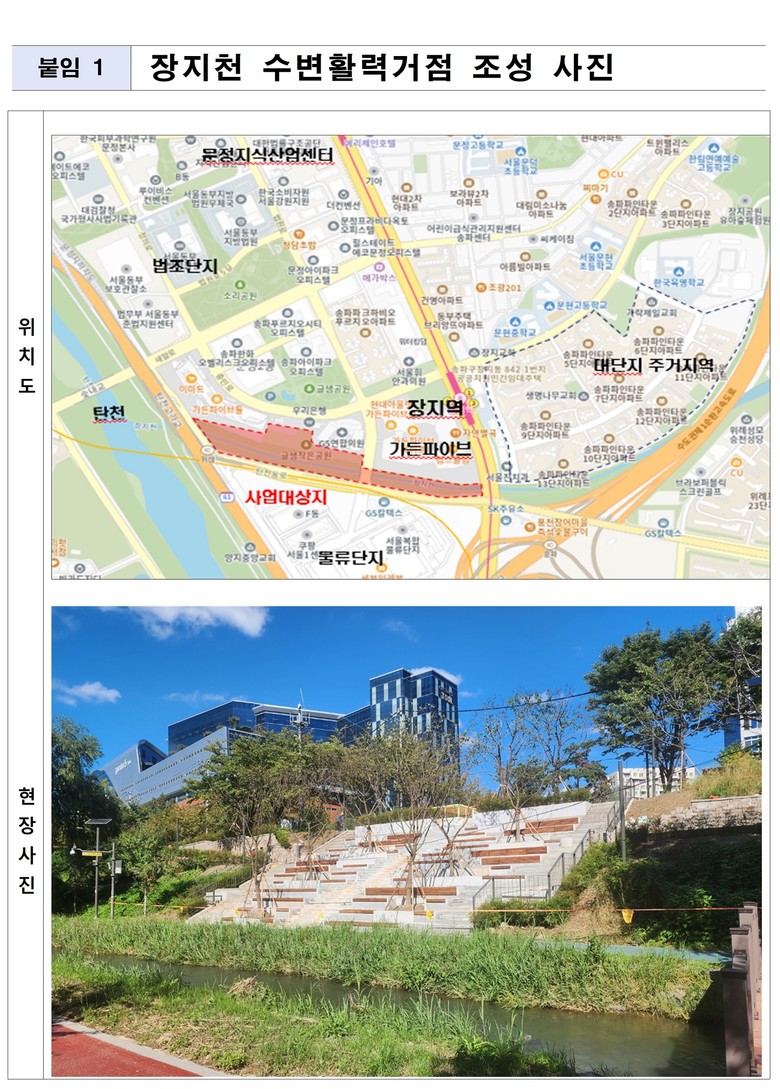 특히 이번 수변활력거점 조성으로 가든파이브, 문정동 법조단지, 인근 대단지 주거지역에서 장지천으로의 접근성이 크게 향상되었다. 시는 이곳이 산책과 휴식을 즐기는 시민들이 즐겨 찾는 새로운 수변 명소로 자리매김할 것으로 기대하고 있다.