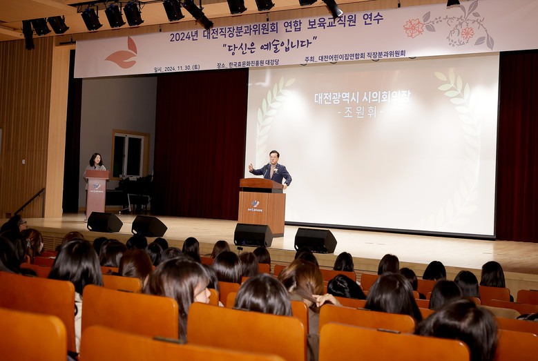 [대전 세계타임즈=이채봉 기자] 대전시의회 조원휘 의장은 30일 ‘대전어린이집연합회 직장분과 2024년 보육교직원연수’가 열린 한국효문화진흥원을 찾아 “보육교직원의 헌신 덕분에 우리 아이들이 밝고 건강하게 성장할 수 있다”며, 따뜻한 보살핌으로 아이들의 바른 길잡이가 되어주는 보육인들의 그간의 노고를 격려하고 감사의 마음을 전했다.
