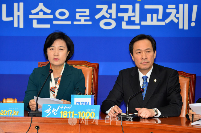 [세계타임즈 심귀영 기자]더불어민주당 쌍두마차인 추미애 대표와 우상호 원내대표가 16일 박사모 등의 경선 참여 가능성에 따른 선거인단 역선택 우려를 놓고 온도차를 나타냈다.