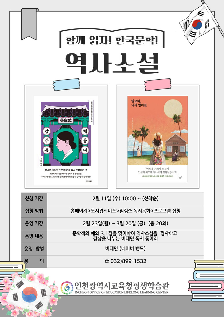 이번 독서동아리는 세계 각국의 다양한 소설을 매월 주제별로 선정하여 운영되며, 2월에는 일제강점기 배경의 우리 역사소설 2권을 필사하고 도서에 대한 감상을 나누며 23일부터 4주간 비대면으로 운영한다.