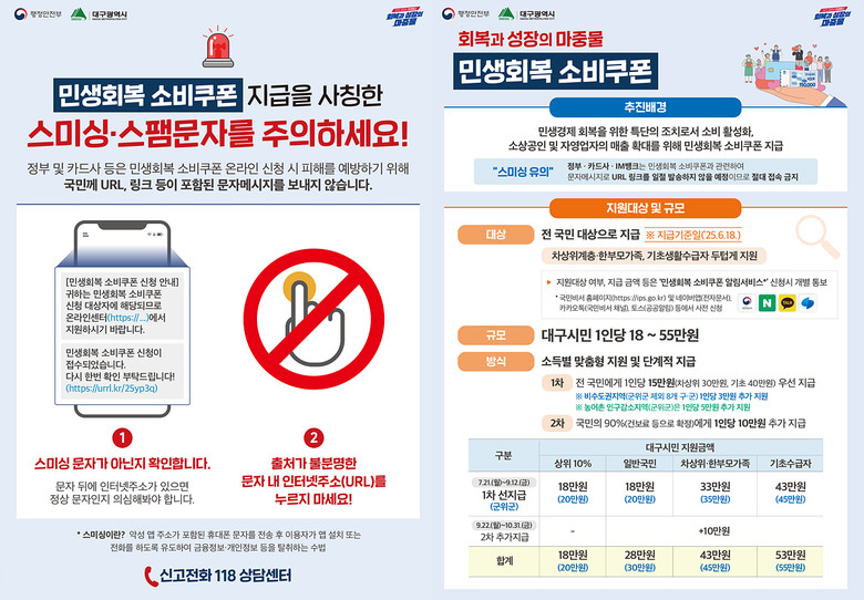 또한, 정부·지자체 또는 카드사는 URL·링크가 포함된 소비쿠폰 지급 관련 문자는 발송하지 않으므로 출처가 불분명한 문자의 URL·링크는 절대 클릭하지 말고, 실수로 클릭한 경우 곧바로 스미싱 상담센터(118)로 신고해 도움을 받을 수 있다.