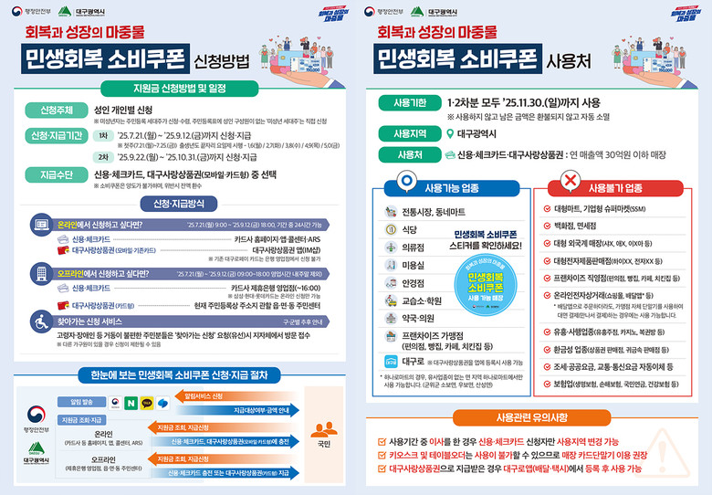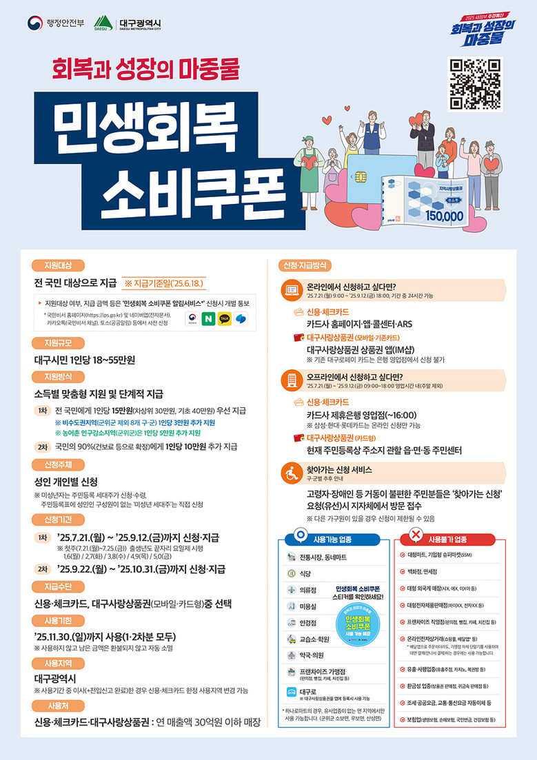 민생회복 소비쿠폰은 내수부진으로 침체된 민생경제에 활력을 불어넣고 경제선순환 구조를 형성하기 위한 회복과 성장의 마중물로서, 전국은 13.9조 원, 대구시는 6,841억 원 규모로 지급될 예정이다.