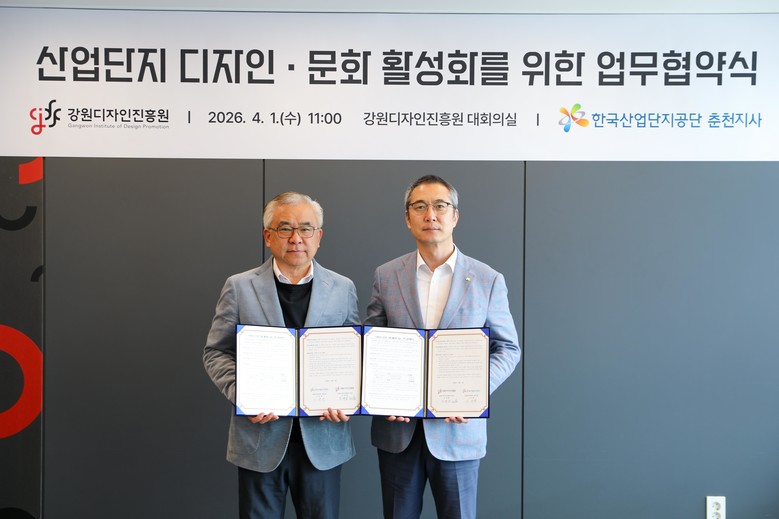 [강원도 세계타임즈=김민석 기자] 강원디자인진흥원(원장 진재한)은 1일 강원디자인진흥원 대회의실에서 한국산업단지공단 강원지역본부 춘천지사(본부장 이규헌)와 산업단지 내 디자인·문화 활성화를 위한 공동사업 추진 업무협약을 체결했다고 밝혔다.