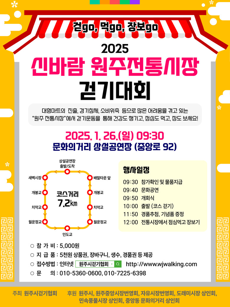 대회 참가는 원주시걷기협회 홈페이지(wjwalking.com)에서 신청할 수 있으며, 참가비는 1인 5천 원이다.