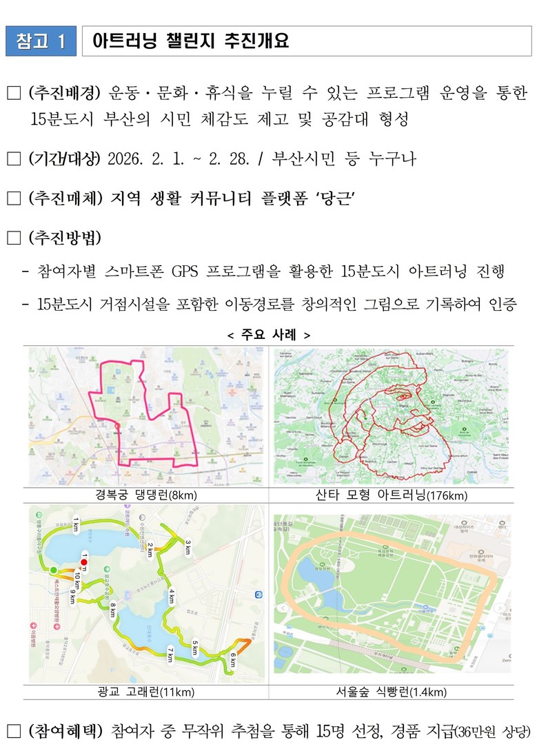 박형준 시장은 “15분도시 부산은 시민 누구나 동네에서 일상과 여가, 건강을 함께 누릴 수 있는 도시”라며, “이번 15분도시 부산 아트러닝 챌린지를 통해 시민들이 가까운 생활권 안에서 건강한 활동을 즐기고, 동네 곳곳의 매력을 새롭게 발견하는 계기가 되길 바란다”라고 전했다.