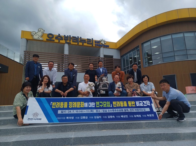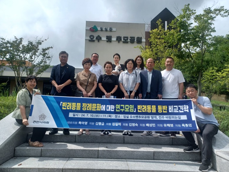 [천안시 세계타임즈=백택기 기자] 천안시의회「반려동물 장례문화에 대한 연구모임」(대표의원 복아영)은 반려동물을 동반하여 10일 부터 11일까지 1박 2일간의 일정으로 국내 1호 반려동물 공공장례식장인 ‘오수 펫 추모공원’과 반려동물 친화도시를 목표로 특화 재생 사업을 추진하는 현장, 그리고 반려동물 지원센터인 ‘오수반려누리’ 등 오수지구와 한국관광공사에서 지정된 반려동물 여행지인 전주 ‘바람쐬는길’을 견학했다.