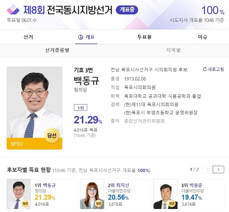 [세계타임즈 백진욱 기자] 정의당 백동규 후보가 제 8회 전국동시지방선거 전남 목포시사선거구에서 시의회의원으로 당선됐다.