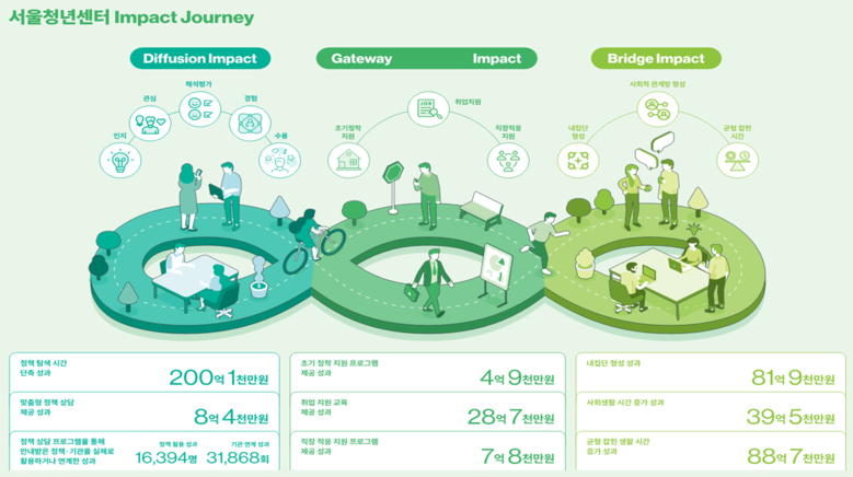 이번 측정은 임팩트 평가 전문 연구기관(임팩트리서치랩)이 '24년 1월~'25년 9월 서울청년센터 사업 결과를 바탕으로 센터 담당자 심층 인터뷰, 센터 이용 경험이 있는 청년 1,404명을 대상으로 한 인터뷰.설문조사 등을 면밀히 분석한 결과다.