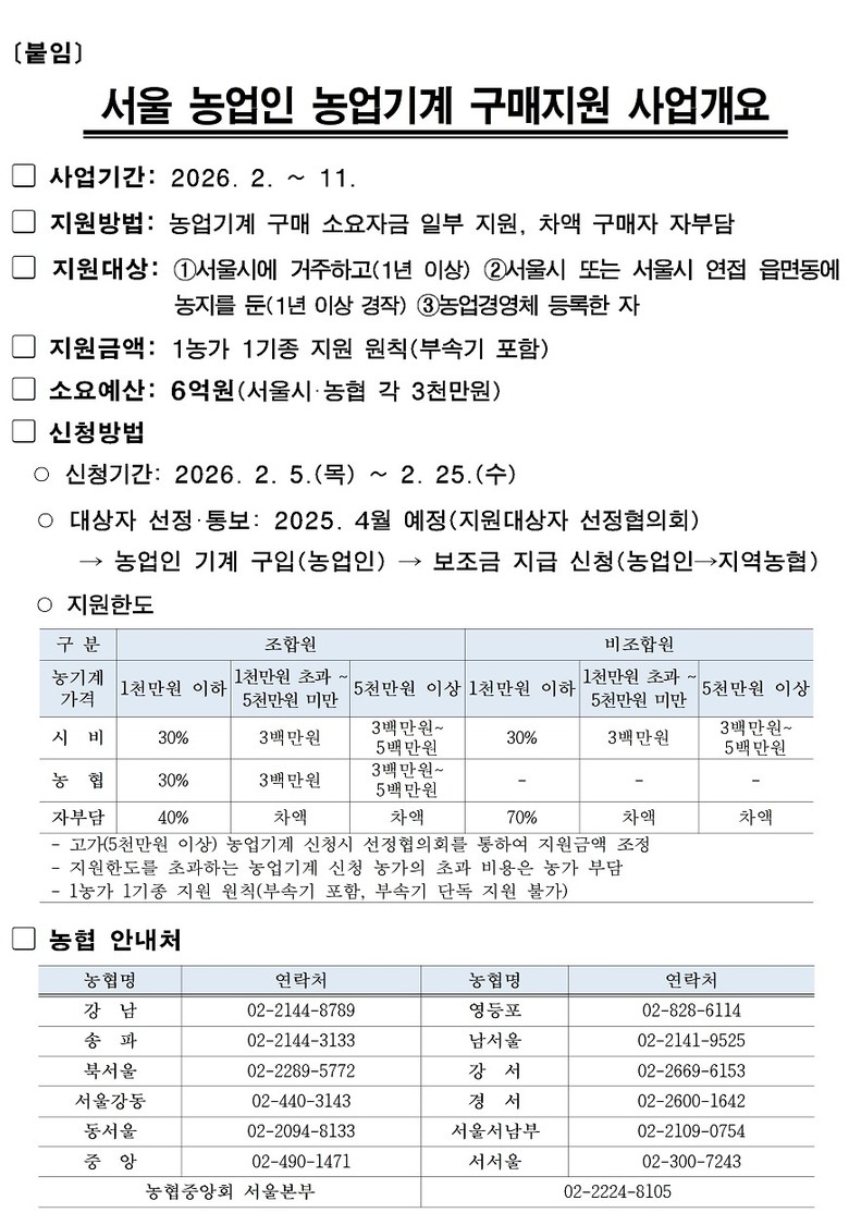 자세한 내용은 서울시 농수산유통과 농업지원팀(02-2133-4462) 또는 농협중앙회 서울본부(02-2224-8105) 및 각 지역농협으로 문의하면 된다.