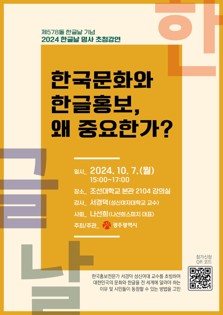 - 월곡초등학교서 ‘찾아가는 우리말 골든벨’ 한글 체험행사 [광주 세계타임즈=손권일 기자] 광주광역시(시장 강기정)는 제578돌 한글날을 맞아 오는 7일 오후 3시 조선대학교 본관 2104호에서 ‘2024 한글날 명사 초청 강연’을 개최한다.